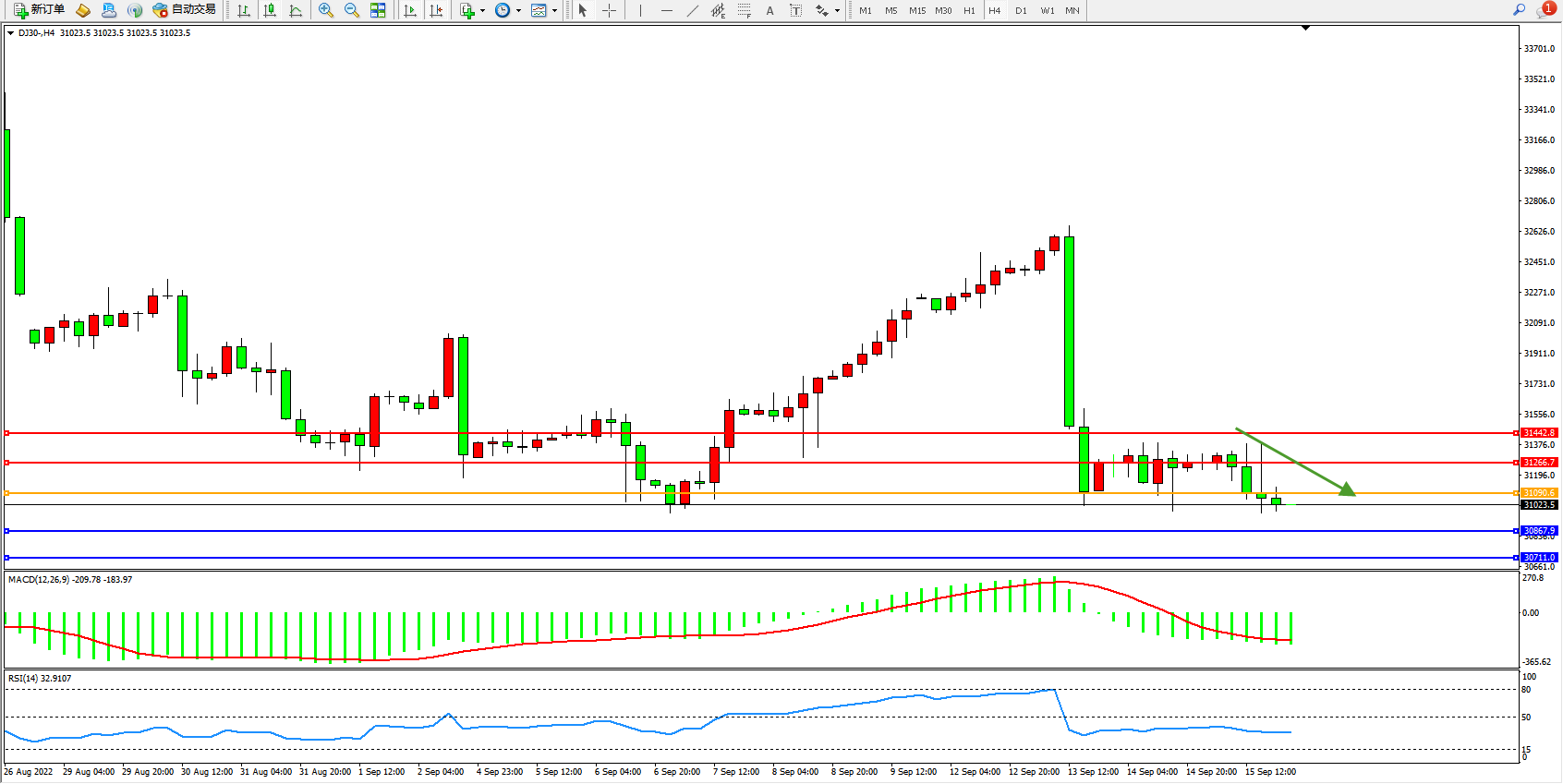 道琼斯指数DJ30——4小时K线图显示: