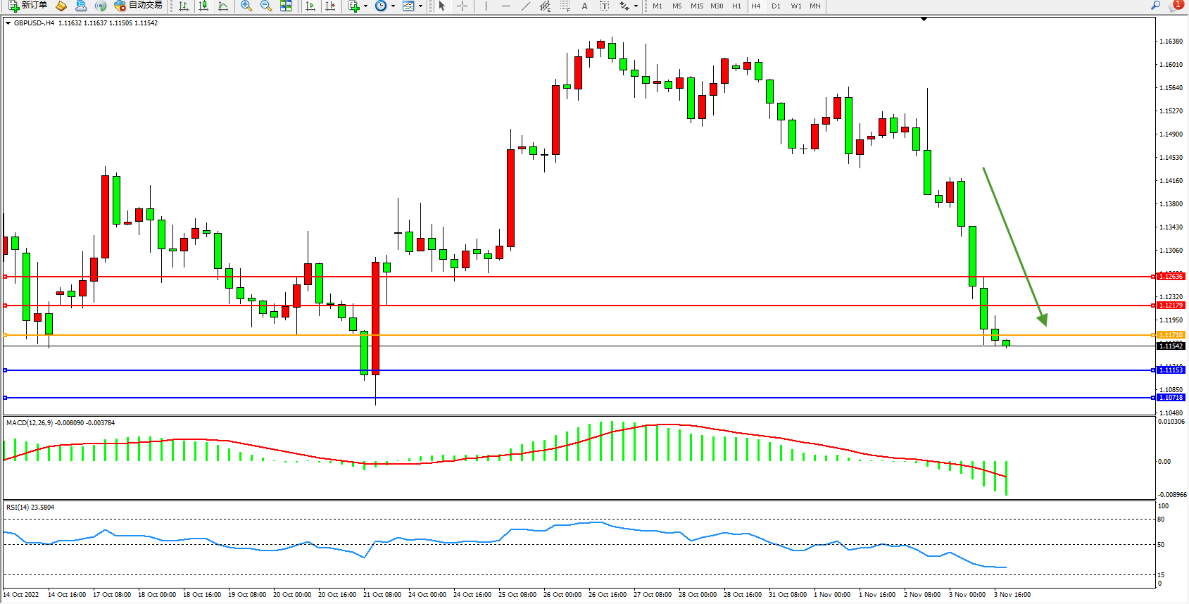 交易策略:1.11710下方看跌,目标1.11153、1.10718