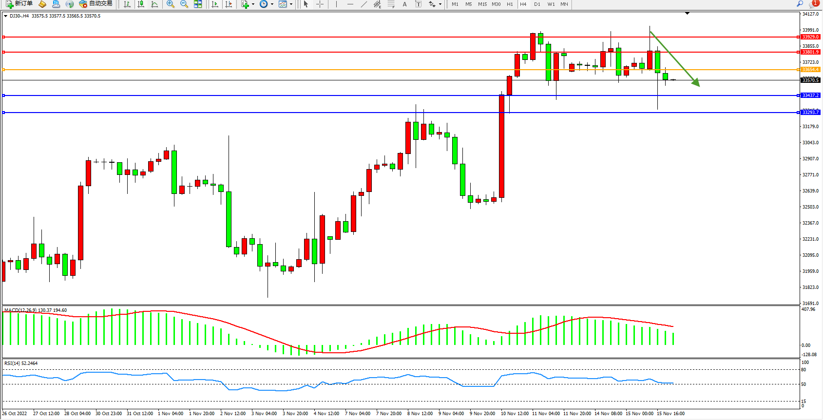 道琼斯指数DJ30——4小时K线图显示: