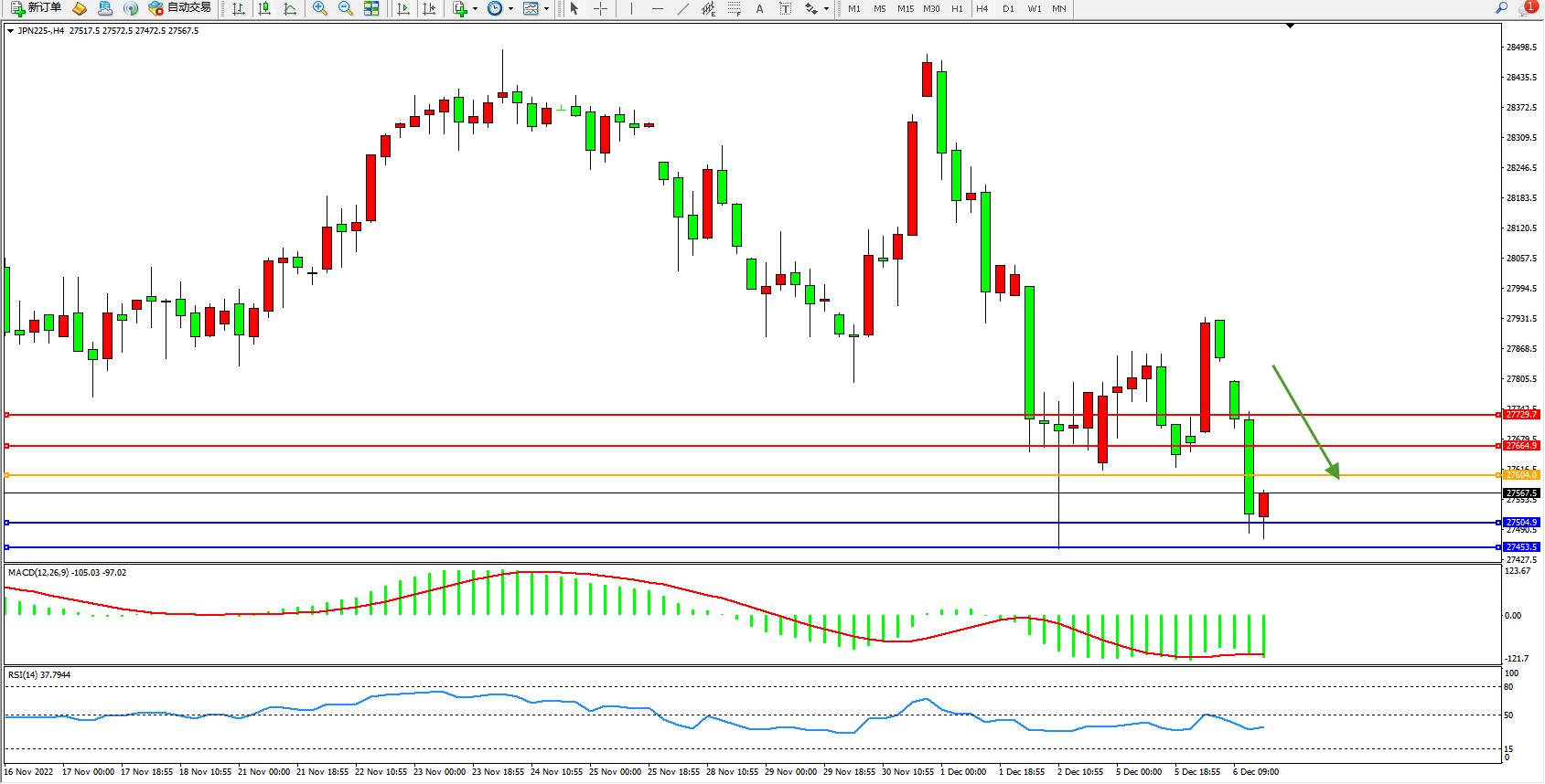 日经指数JPN225——4小时K线图显示: