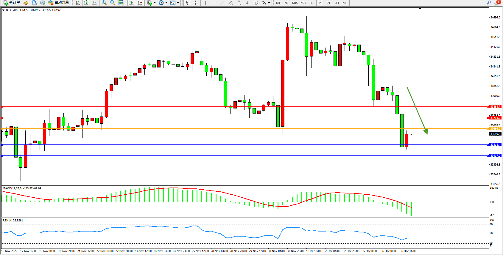 道琼斯指数DJ30——4小时K线图显示: