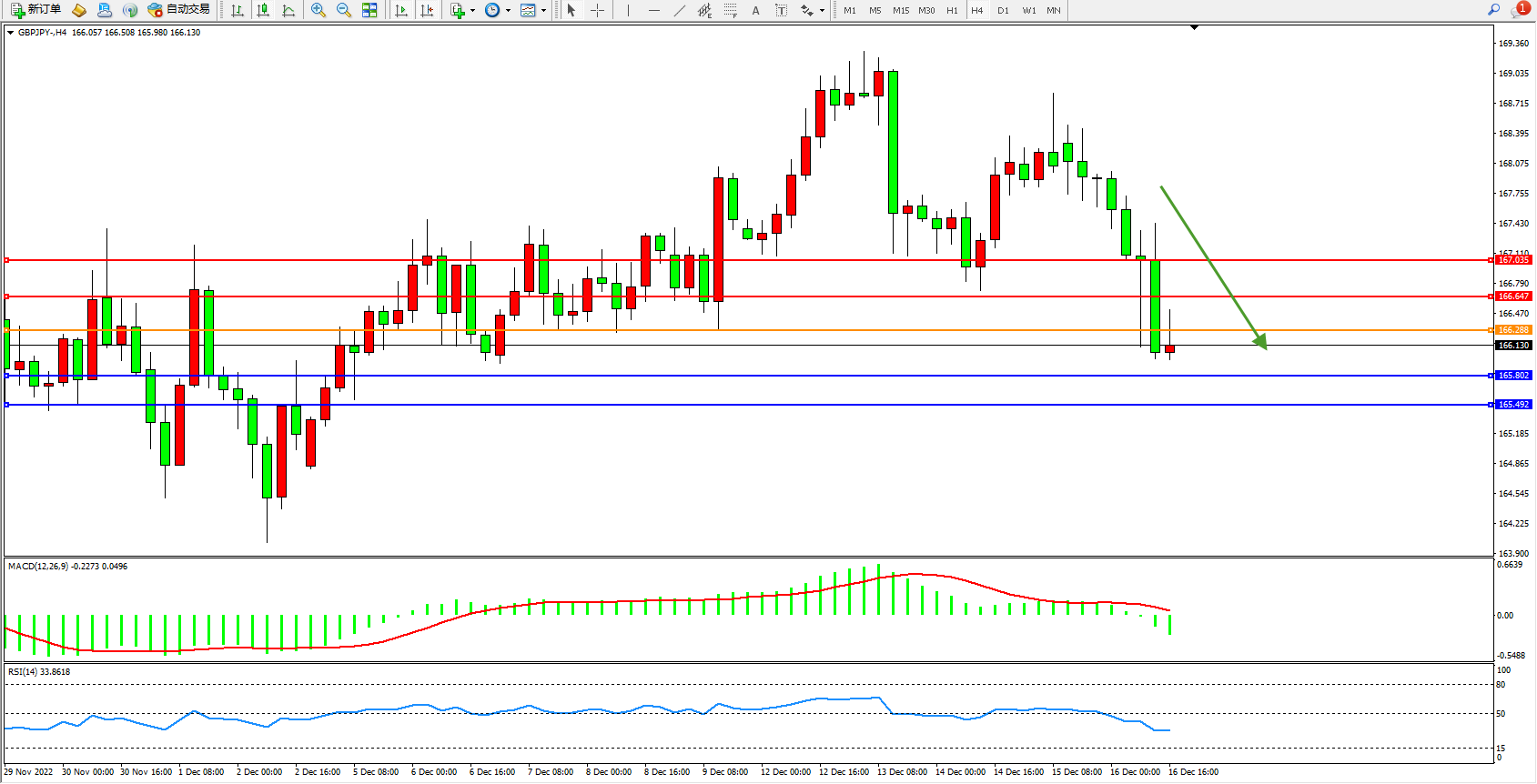 交易策略:166.288下方看跌,目标165.802、165.492