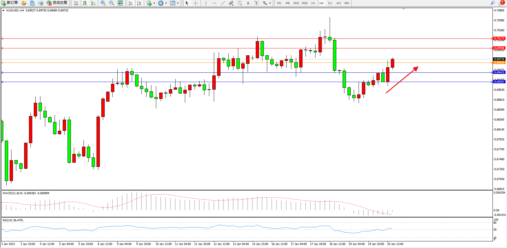 交易策略:0.69720上方看涨,目标0.69958、0.70173