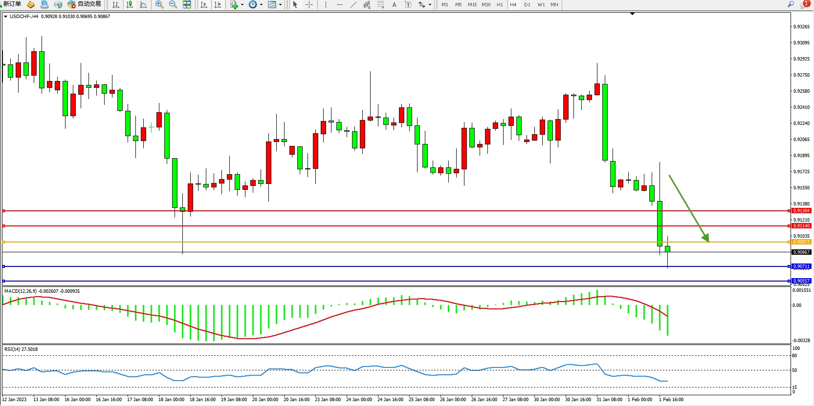 美元瑞郎USDCHF——4小时K线图显示: