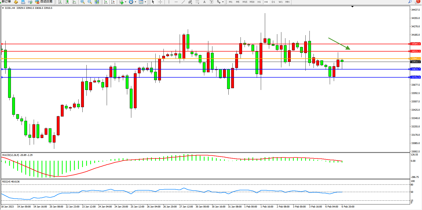 道琼斯指数DJ30——4小时K线图显示: