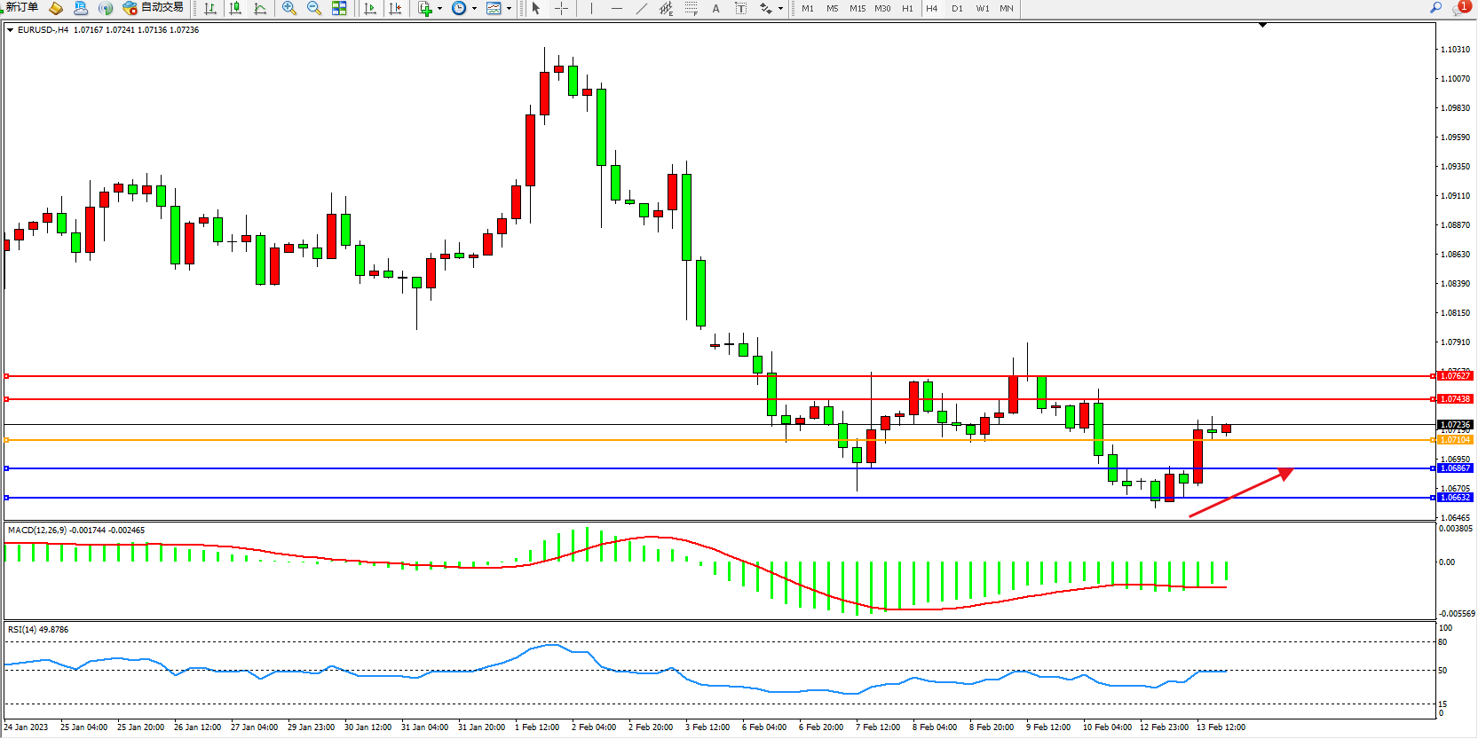 欧元美元EURUSD—4小时K线图显示: