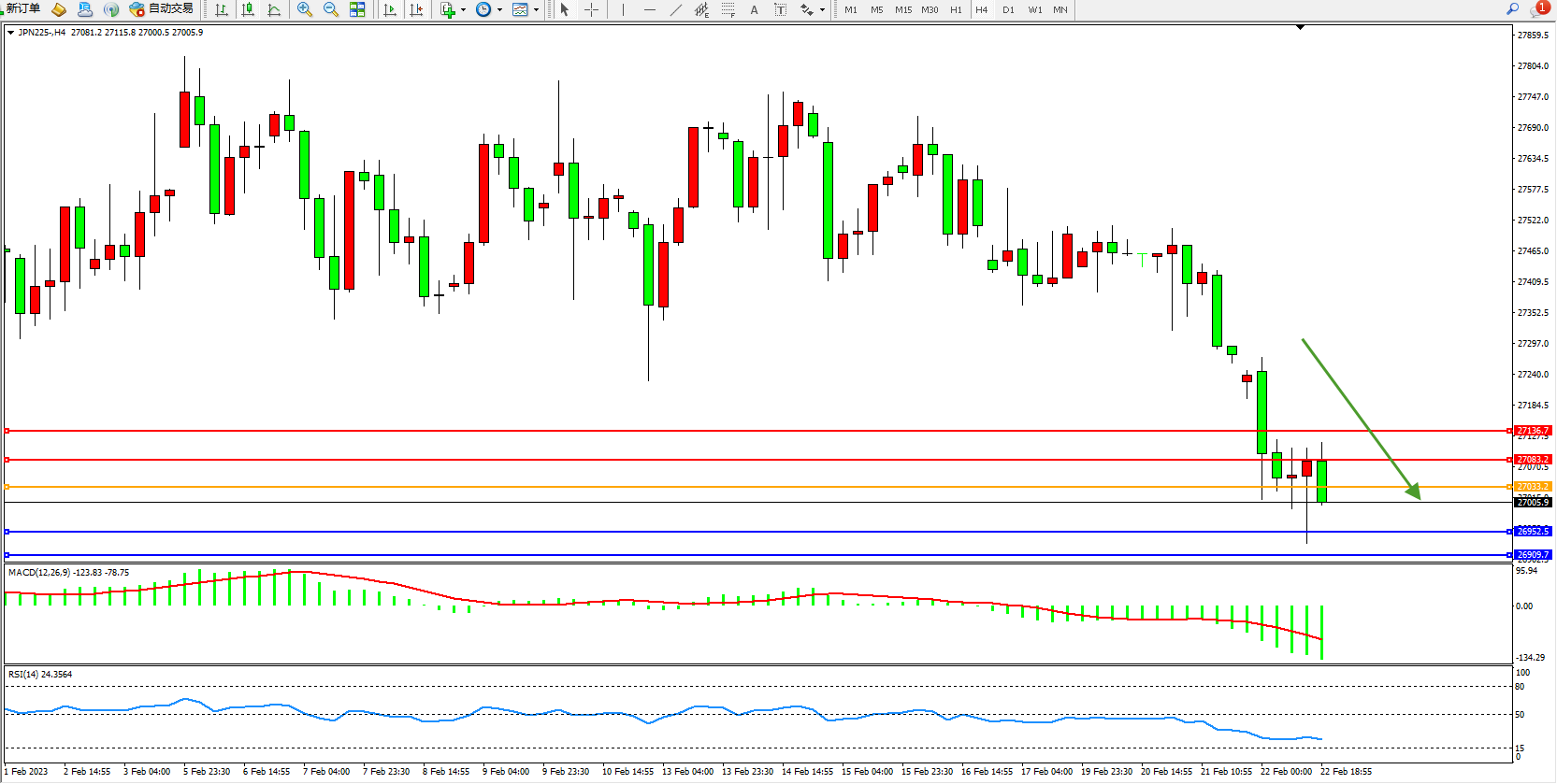 日经指数JPN225——4小时K线图显示: