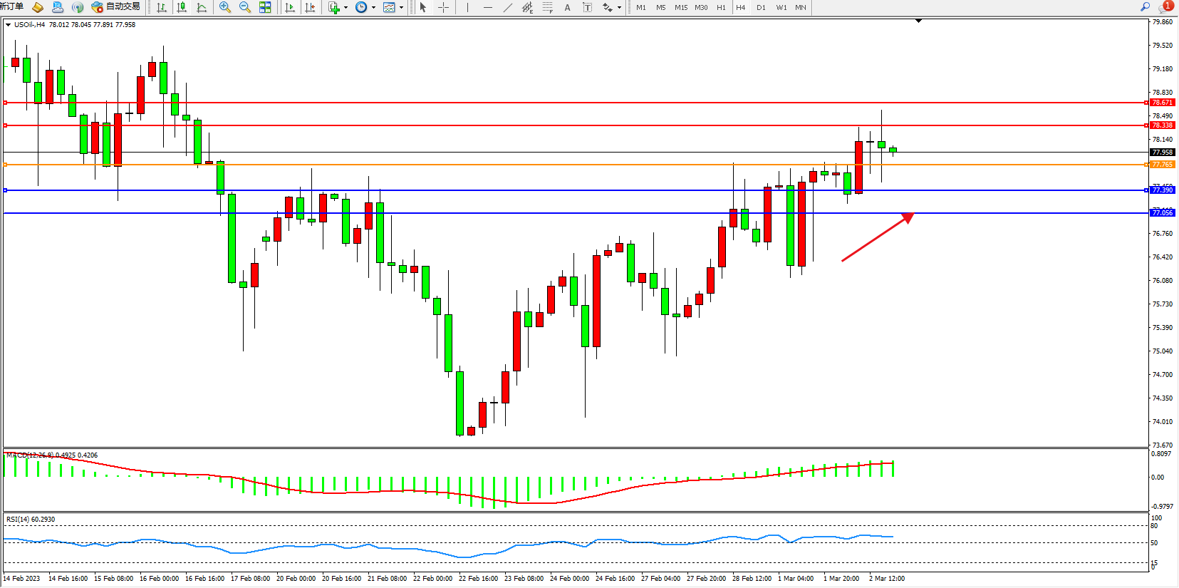 原油USOil——4小时K线图显示: