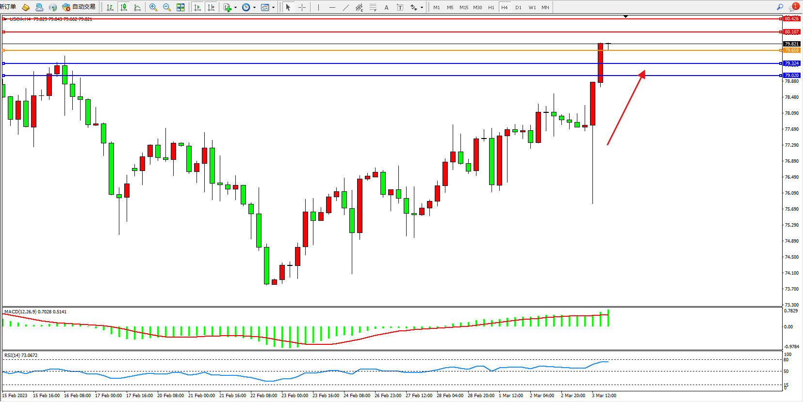 原油USOil——4小时K线图显示:
