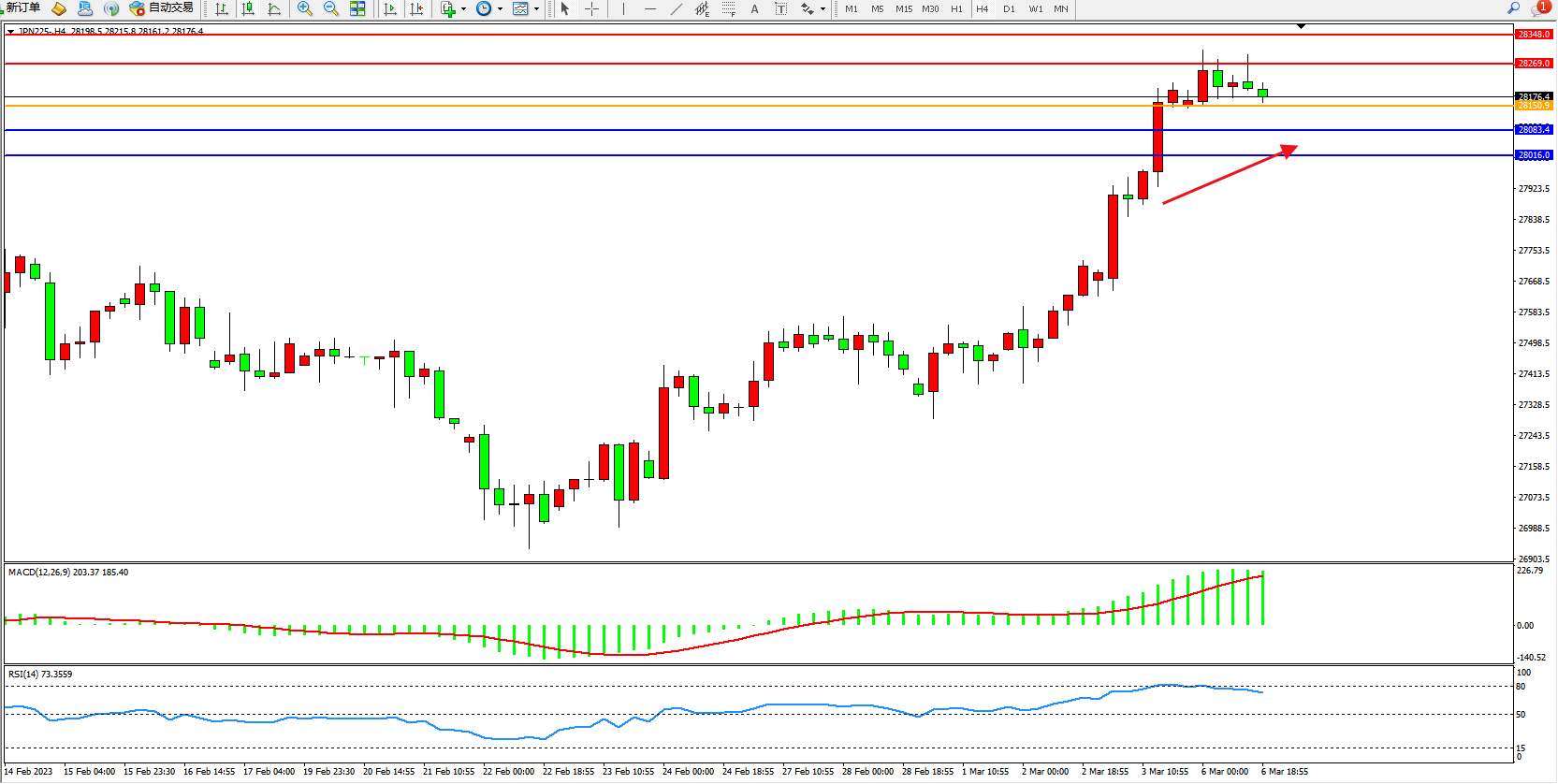 4小时图看:高位整理上移后整理,市场整体处于高位徘徊,短期有继续向上移动迹象,MACD指标处于多头区域高位整理,RSI指标处于高位超买区80均衡线下侧徘徊;