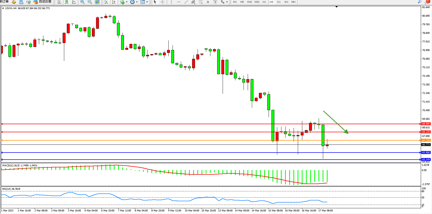 交易策略:67.228下方看跌,目标65.908 65.149