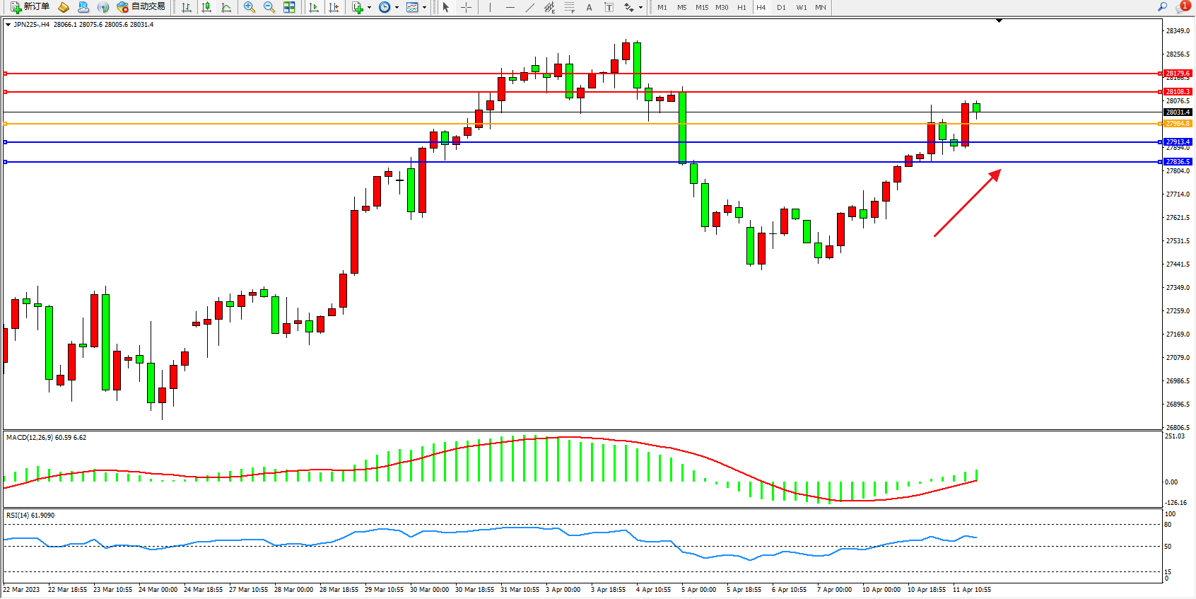 日经指数JPN225——4小时K线图显示: