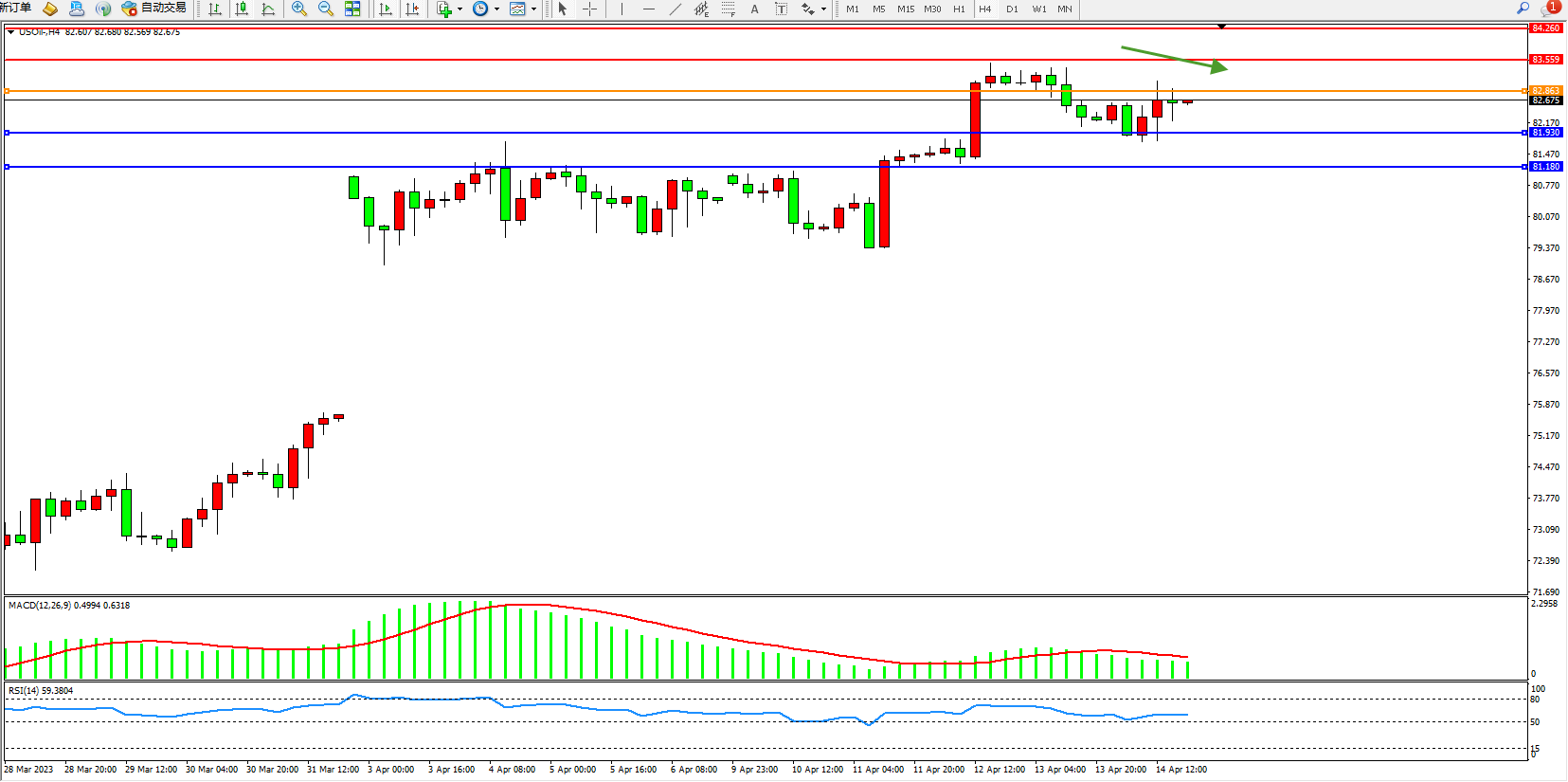 原油USOil——4小时K线图显示: