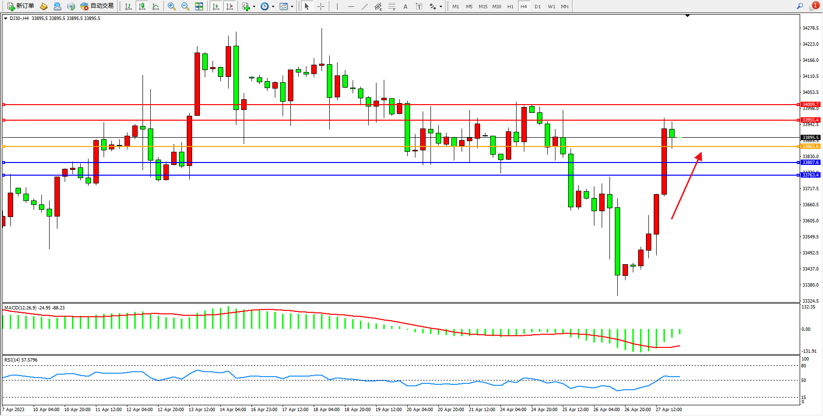 道琼斯指数DJ30——4小时K线图显示: