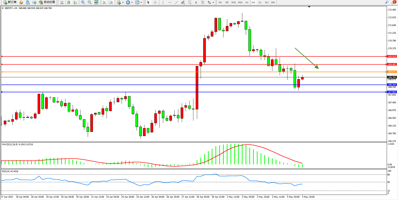 交易策略:169.071下方看跌,目标168.364  167.965