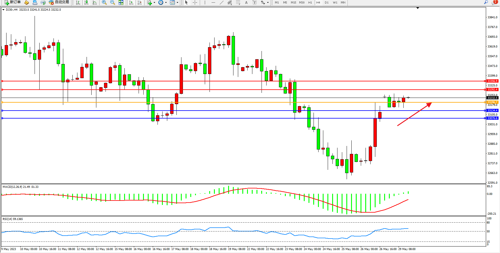 道琼斯指数DJ30——4小时K线图显示: