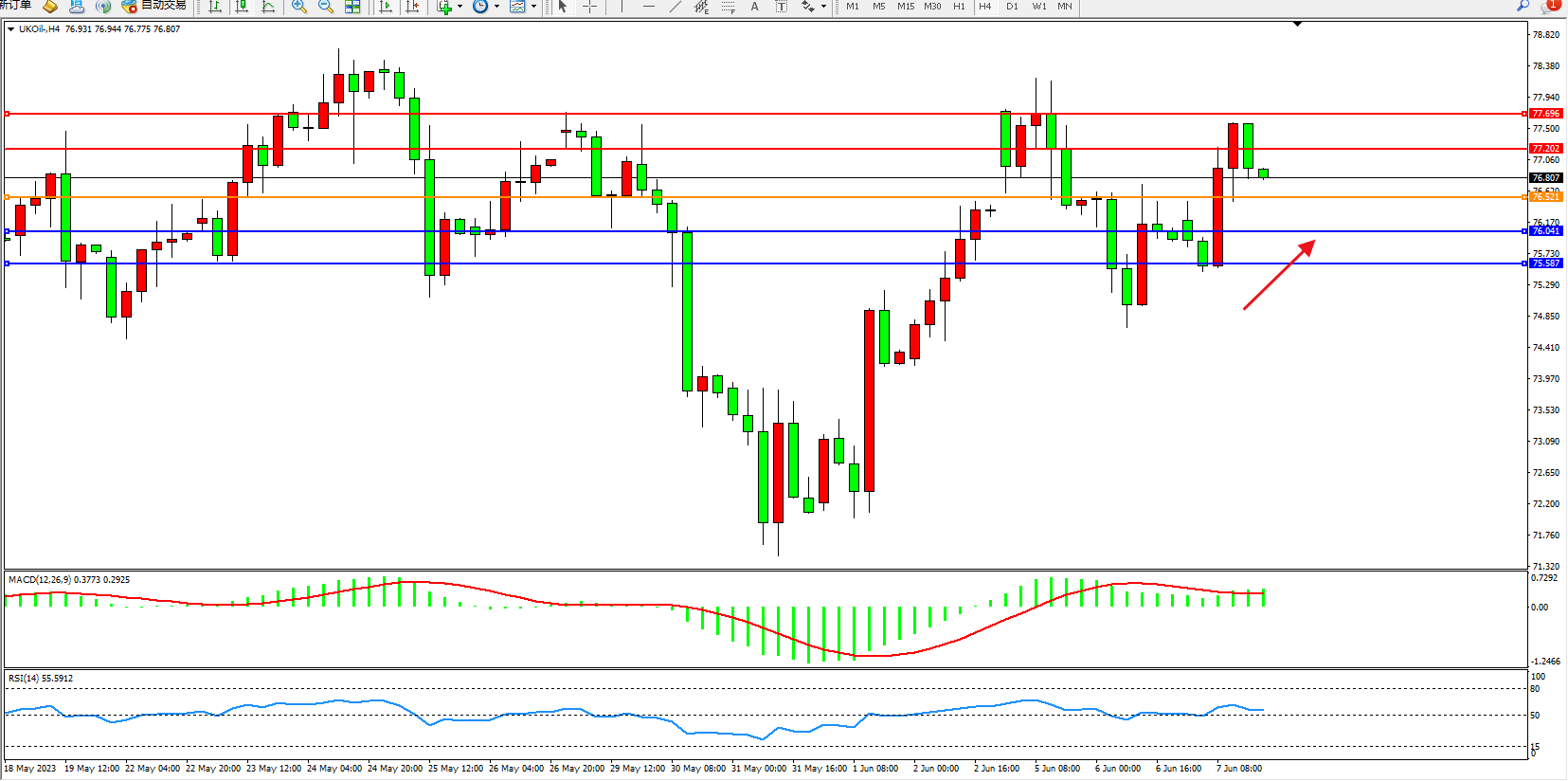 交易策略:76.521上方看涨,目标77.202  77.696