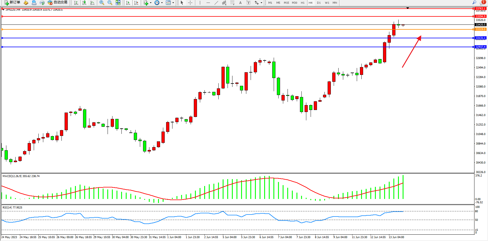 日经指数JPN225——4小时K线图显示: