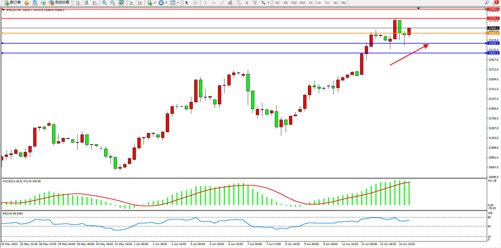 日经指数JPN225——4小时K线图显示: