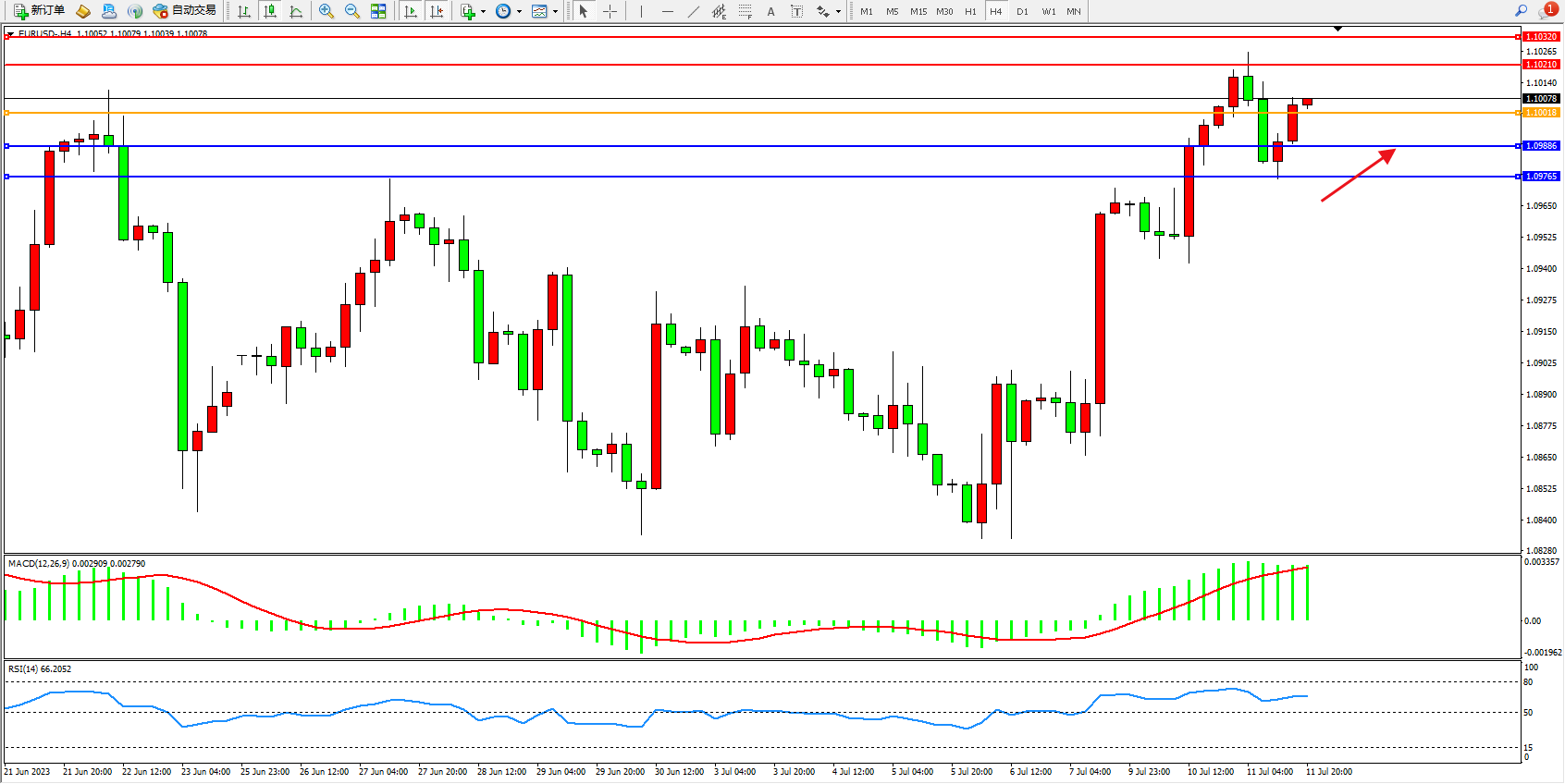 欧元美元EURUSD—4小时K线图显示: