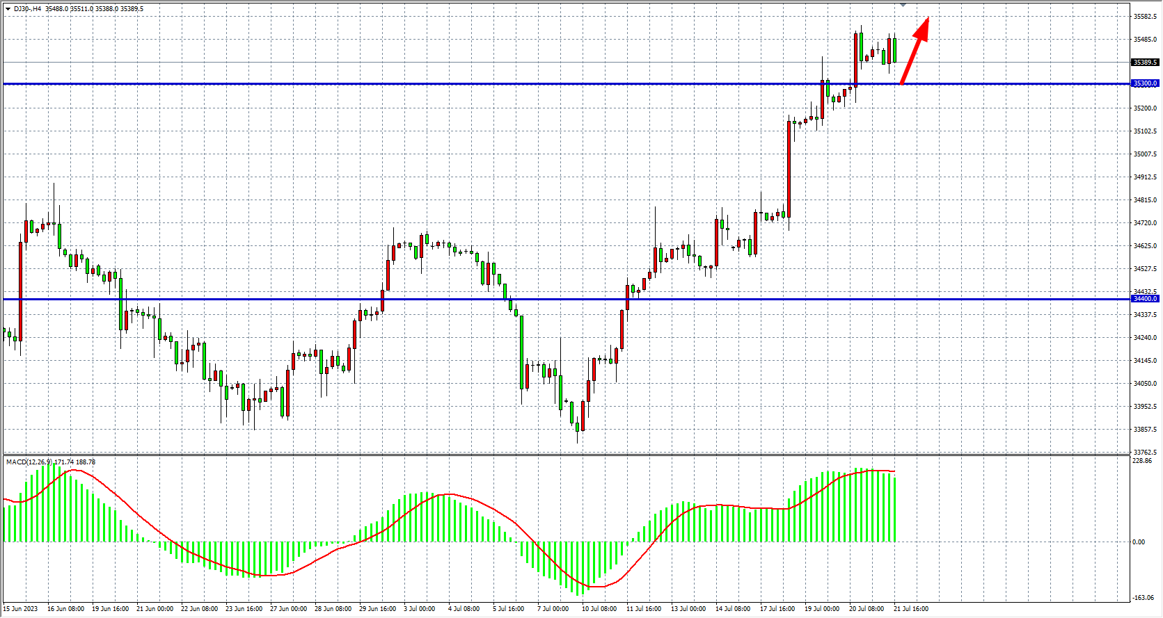 4小时图看,道指在35500附近短暂盘整,MACD量能维持零轴上,多头趋势仍较强劲,支撑关注35300-35000附近,阻力35500-35800。
