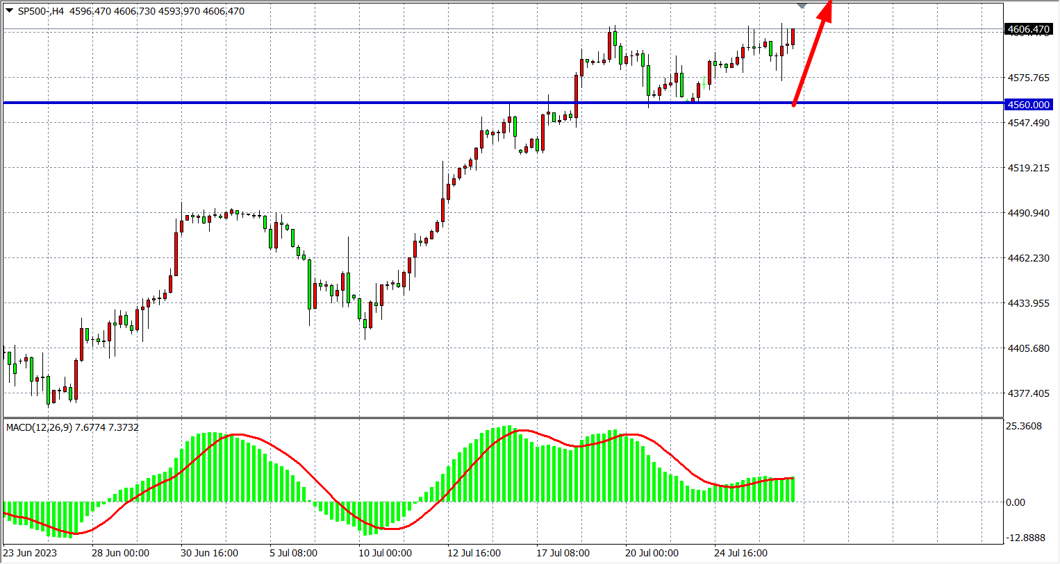 4小时图看,标普在4560上继续走高,MACD量能在零轴上温和放量,支撑继续关注4560附近,上方阻力看4600-4640。
