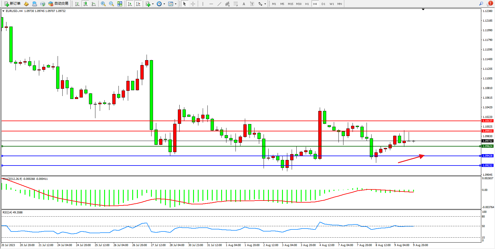 4小时图看:低位多头动力维持弱势整理缓慢上行,市场看涨情绪涌现,短期有继续向上移动迹象,MACD指标处于0轴线下侧弱势徘徊,RSI指标处于50均衡线附近整理;