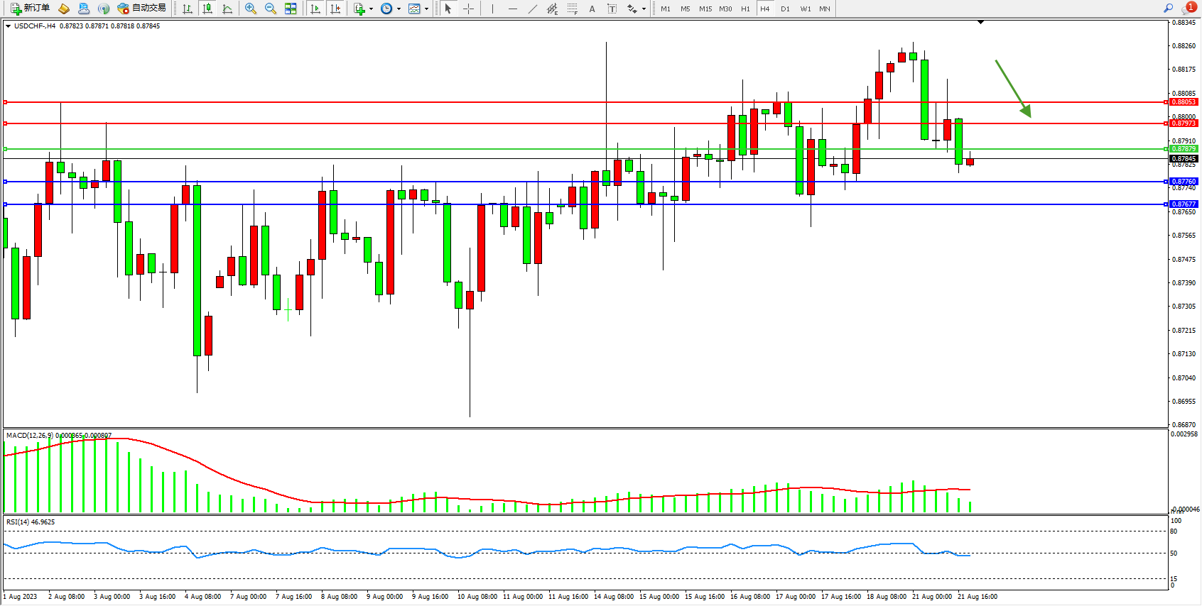 美元瑞郎USDCHF——4小时K线图显示:
