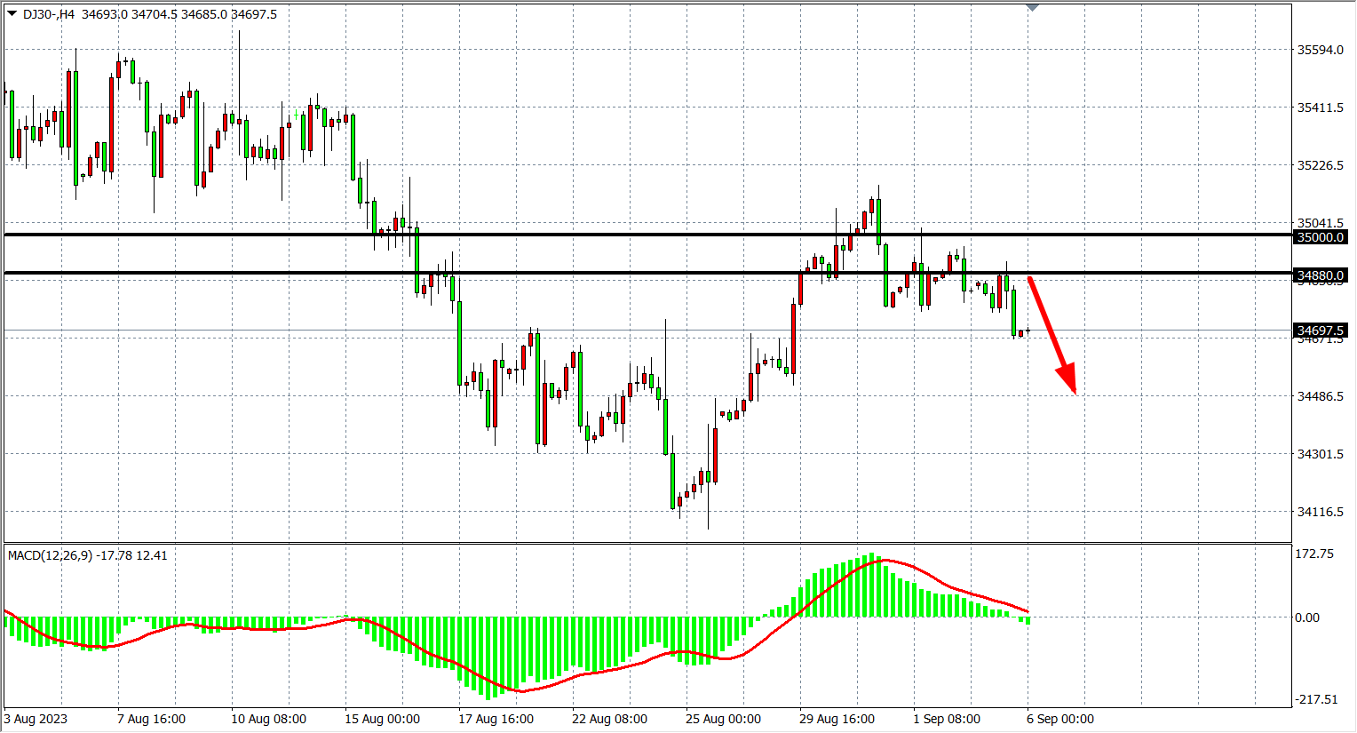 4小时图看,道指在35000之下继续回落,MACD量能下穿零轴之下,短期空头走势延续,关注34880-35000的阻力,下方看34500-34300附近。