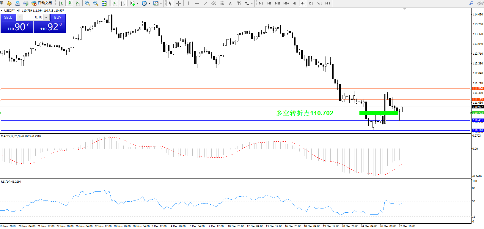 备选策略:110.702下方看跌,目标110.451、110.110