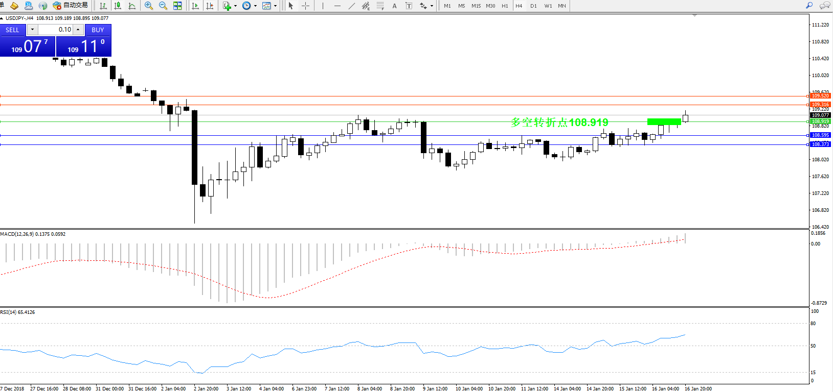 交易策略:108.919上方看涨,目标109.316109.520