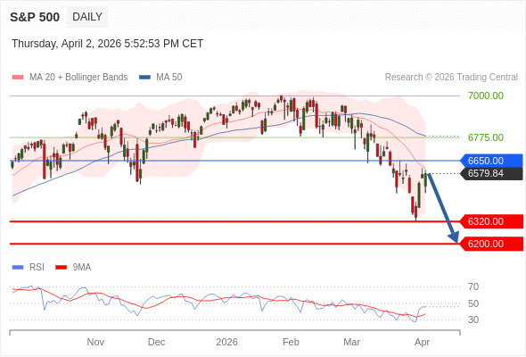 交易策略: 在 6650.00 之下,看跌,目标价位为 6320.00 ,然后为 6200.00 。