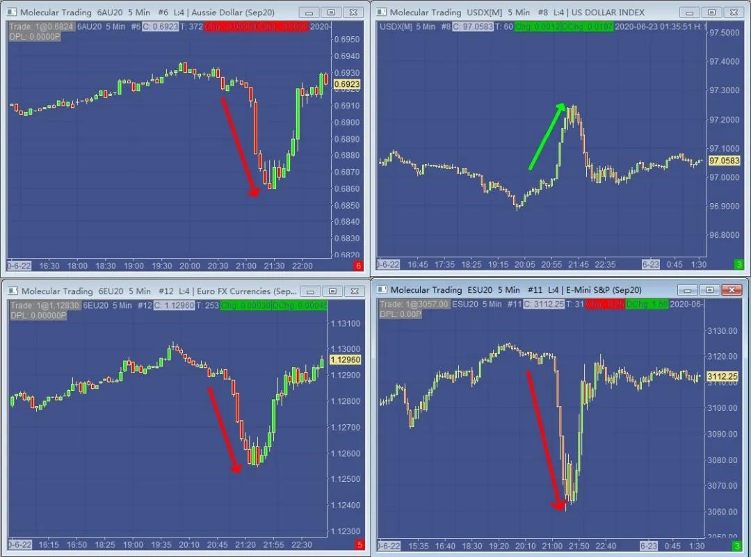 今天亚盘9点许出现了一波诡异行情,非美货币应声大幅下挫,同时标普500出现快速下跌,从3120直接跌穿3100整数位置,最低触及3060低点。与此同时,美元指数出现快速反弹突破97关口最高值97.30。