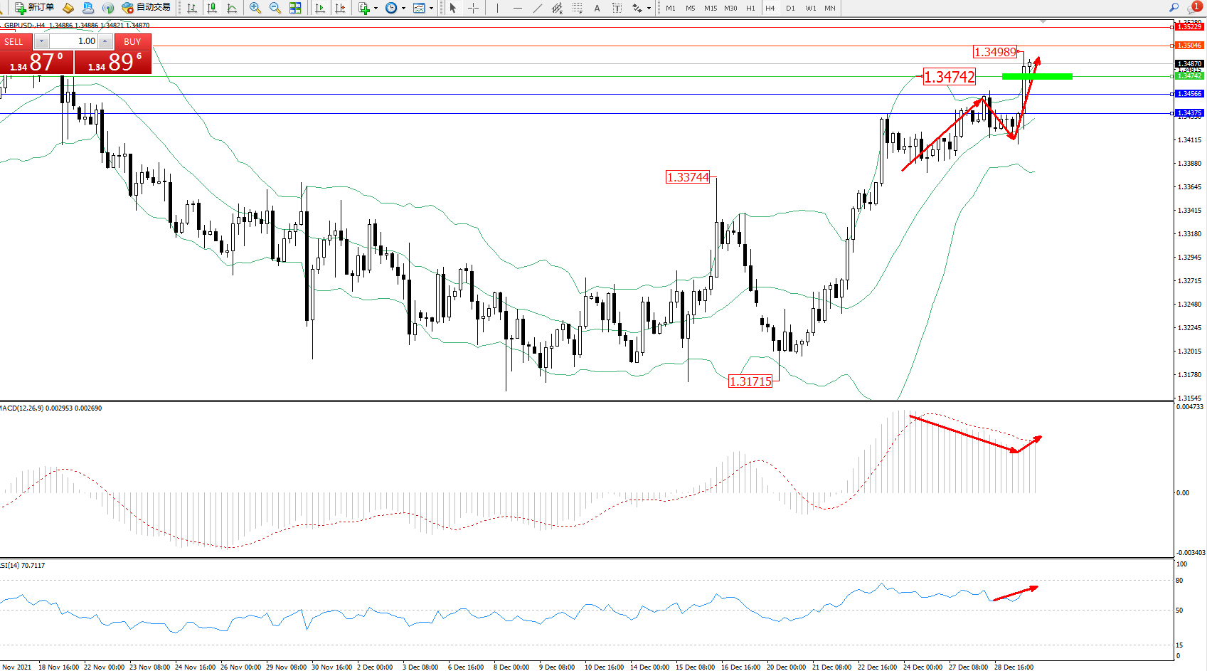 交易策略:1.34742上方看涨,目标1.35046、1.35229