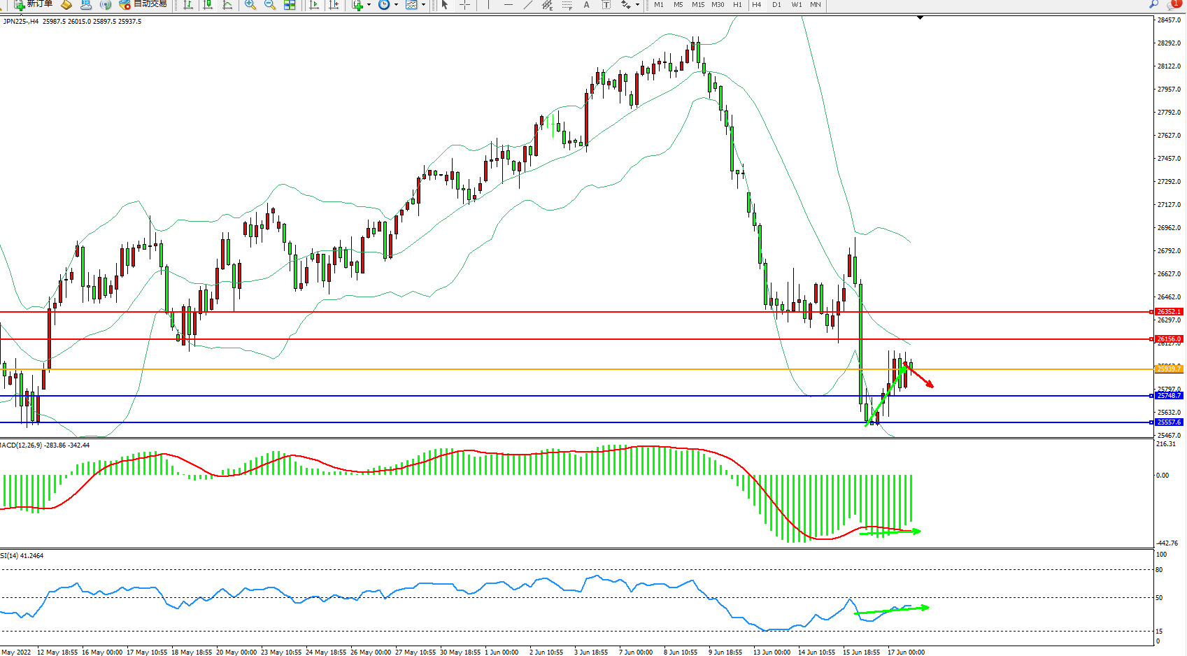 日经指数JPN225——4小时K线图显示: