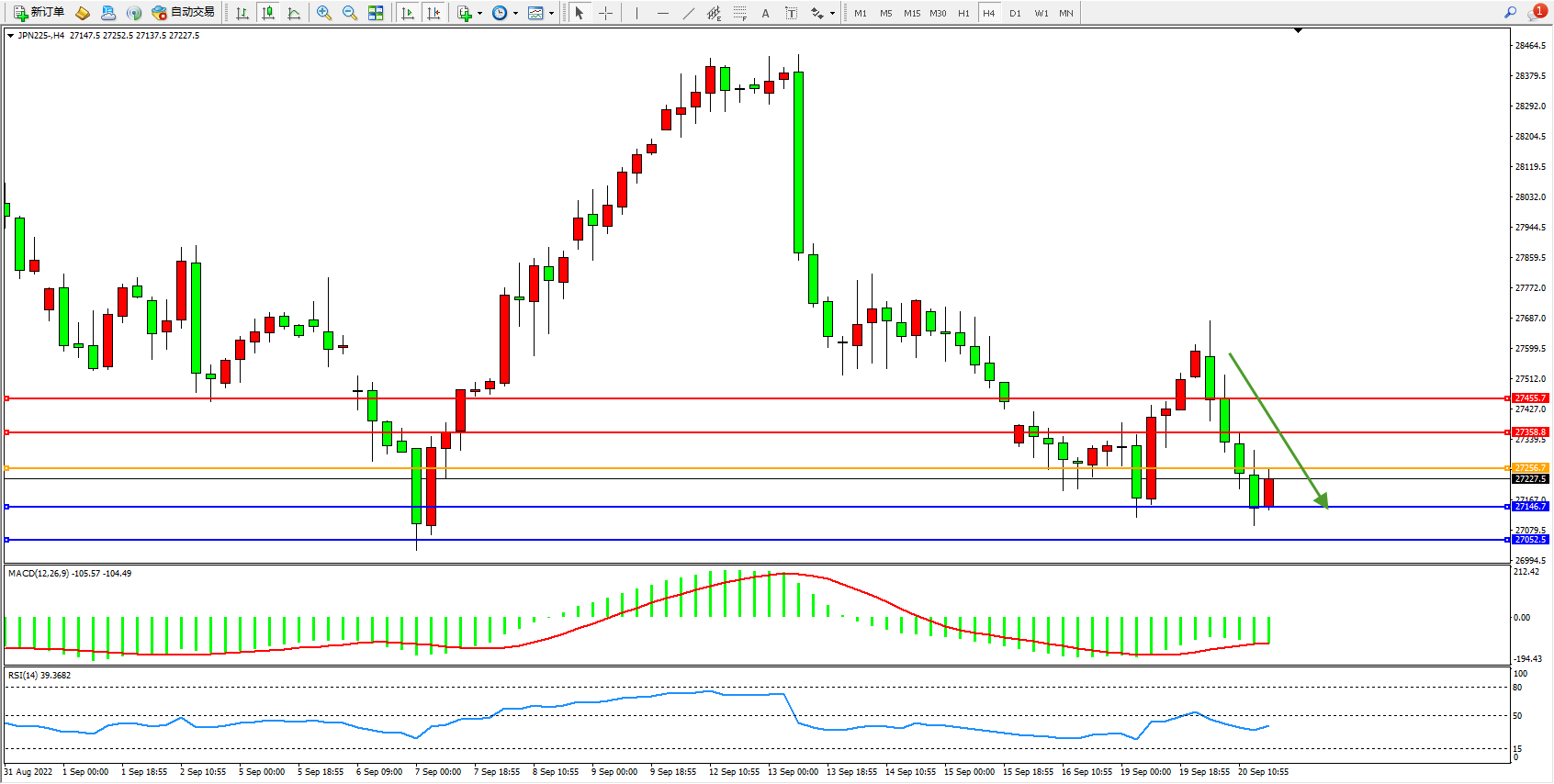 日经指数JPN225——4小时K线图显示: