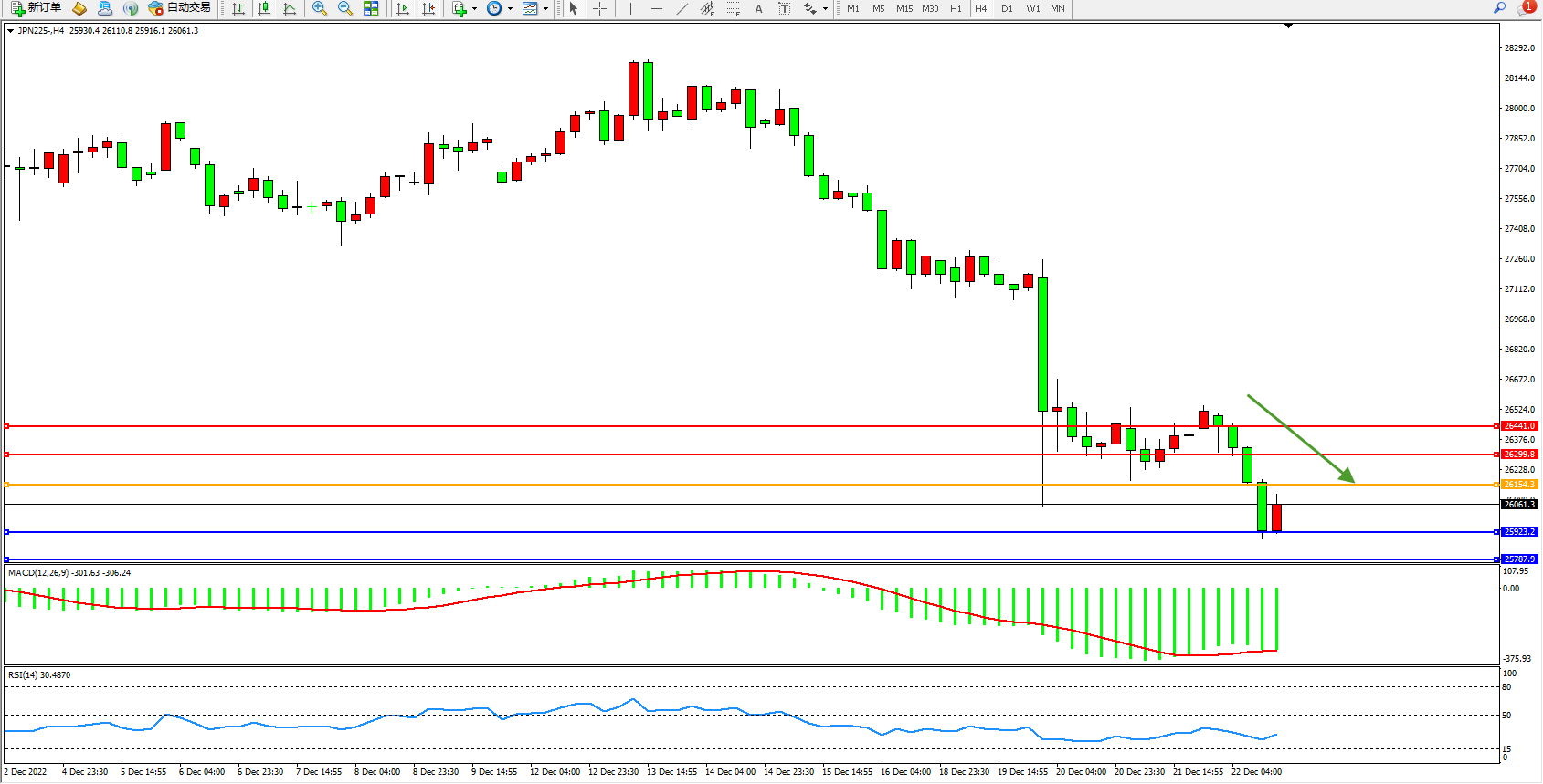 日经指数JPN225——4小时K线图显示: