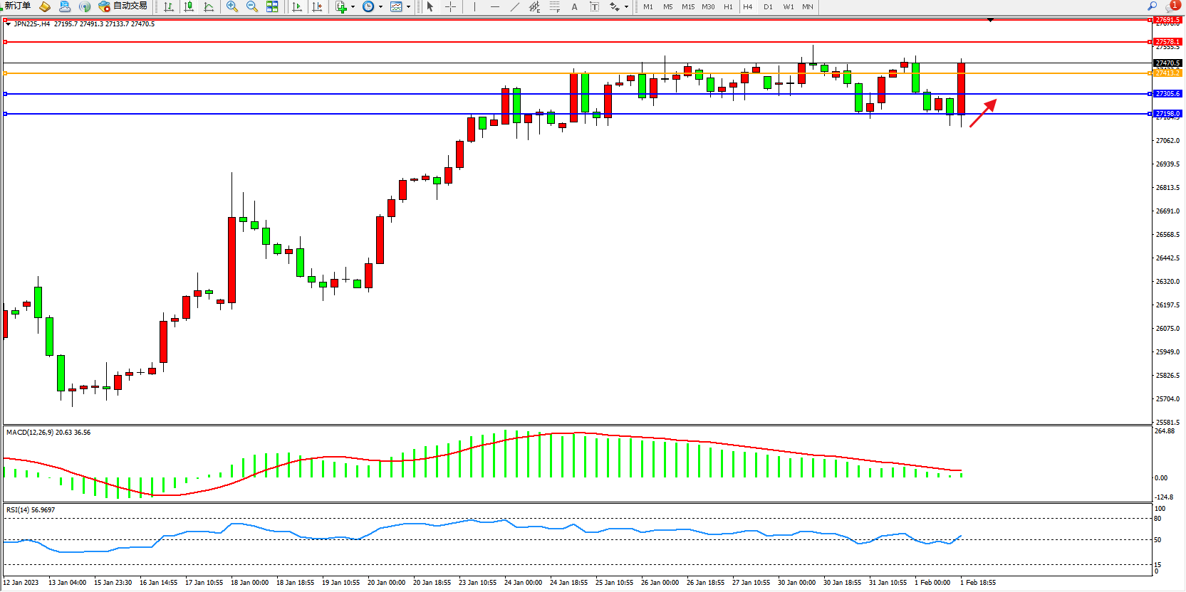 日经指数JPN225——4小时K线图显示: