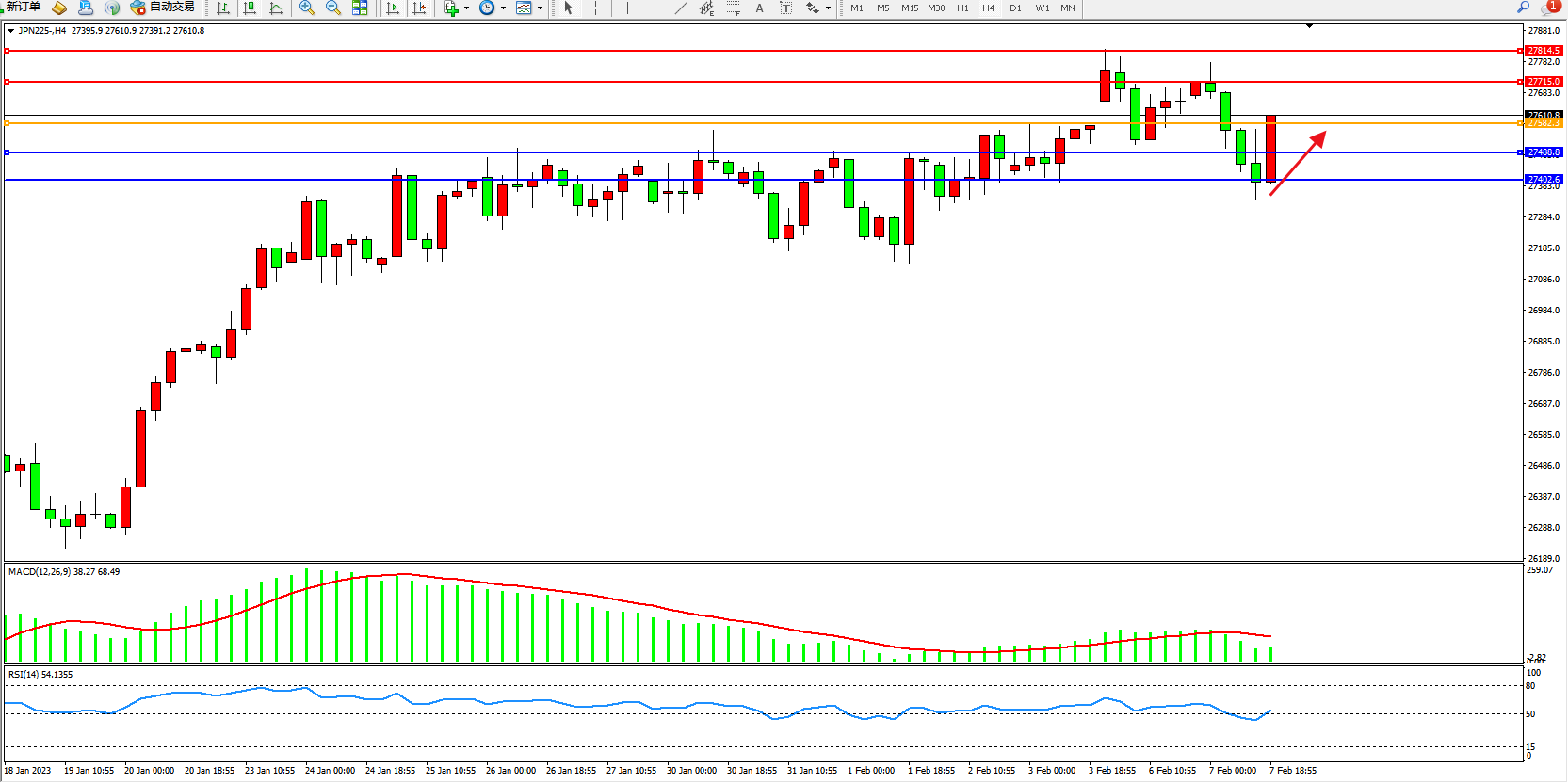 日经指数JPN225——4小时K线图显示: