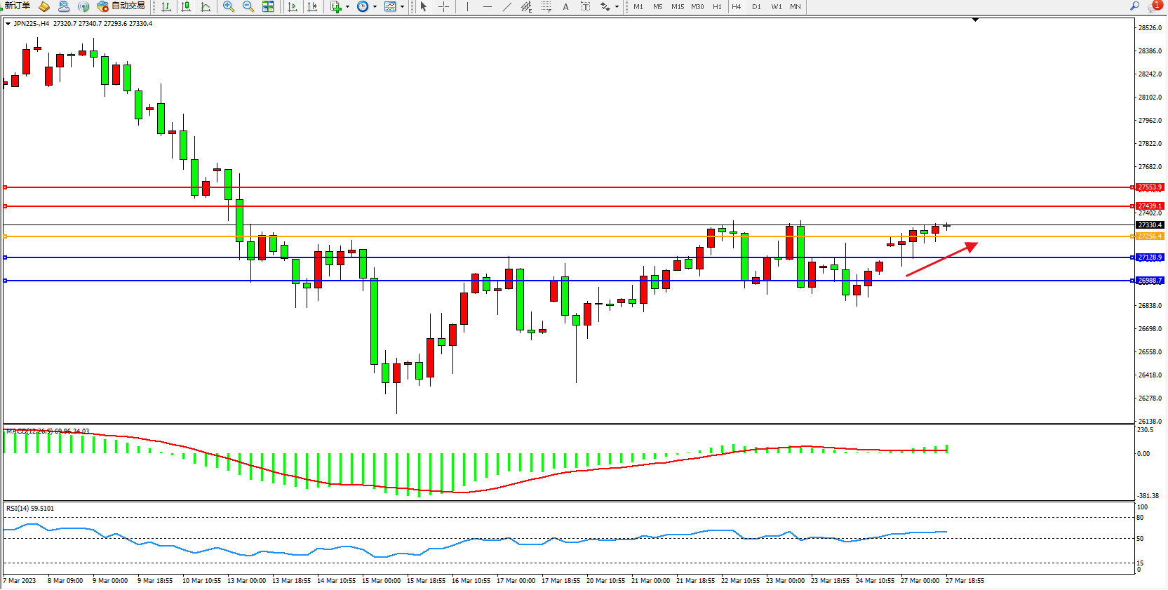 日经指数JPN225——4小时K线图显示:
