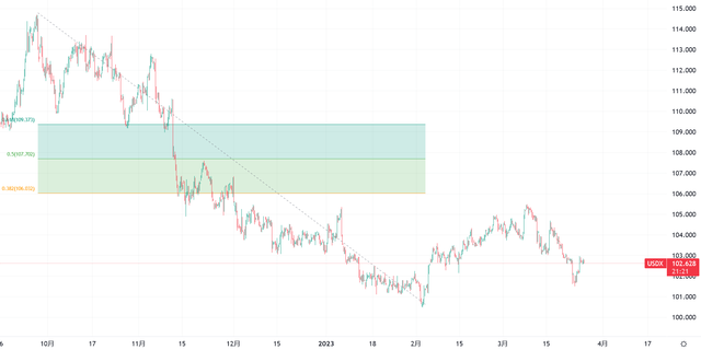 Pepperstone激石分析师Candice表示,若没有爆发大规模流动性危机情况,美元指数风险偏向下行。2月至3月的反弹中,美元指数没有触及下跌行情的38.2%斐波那契回撤位置,说明反弹力度弱,技术层面上延续下行概率较大。