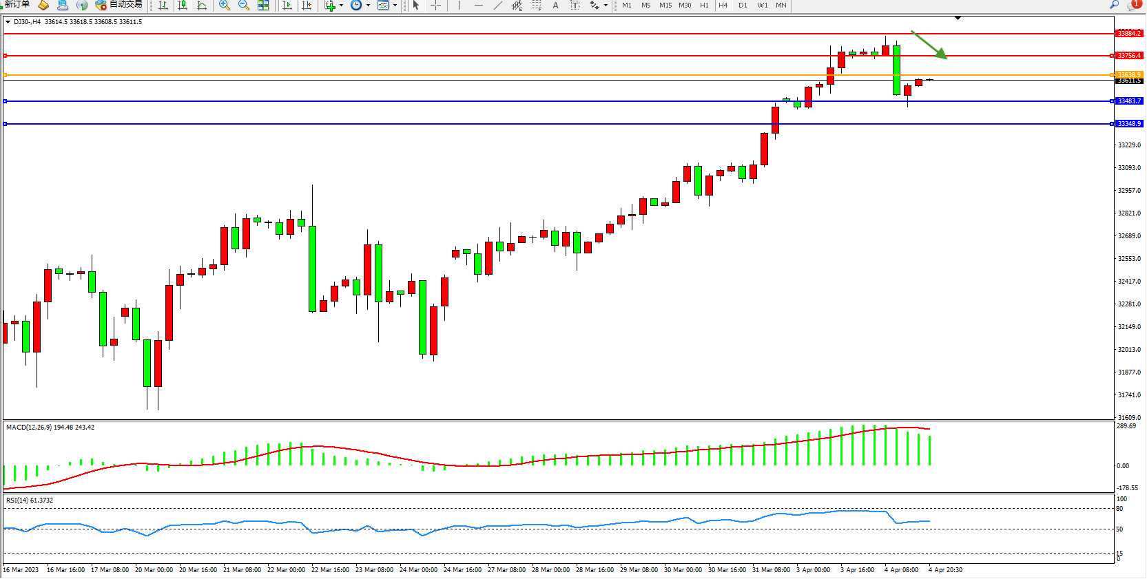道琼斯指数DJ30——4小时K线图显示: