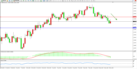 空头动力震荡下移,短期跌势或将延续,市场整体处于偏空头走势中,上方压制关注1.24368附近,低位支撑关注1.22256附近震荡,MACD指标维持震荡下移至0轴线下侧缓慢下行,RSI指标处于50均衡线下侧弱势整理,如图: