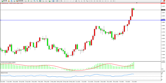 多头动力强势拉升上扬,市场看涨情绪笼罩,高位压制关注1.32106附近震荡,低位支撑关注1.29318附近震荡,MACD指标处于多头区域不断上移,RSI指标处于多头区域高位80均衡线附近徘徊,如图: